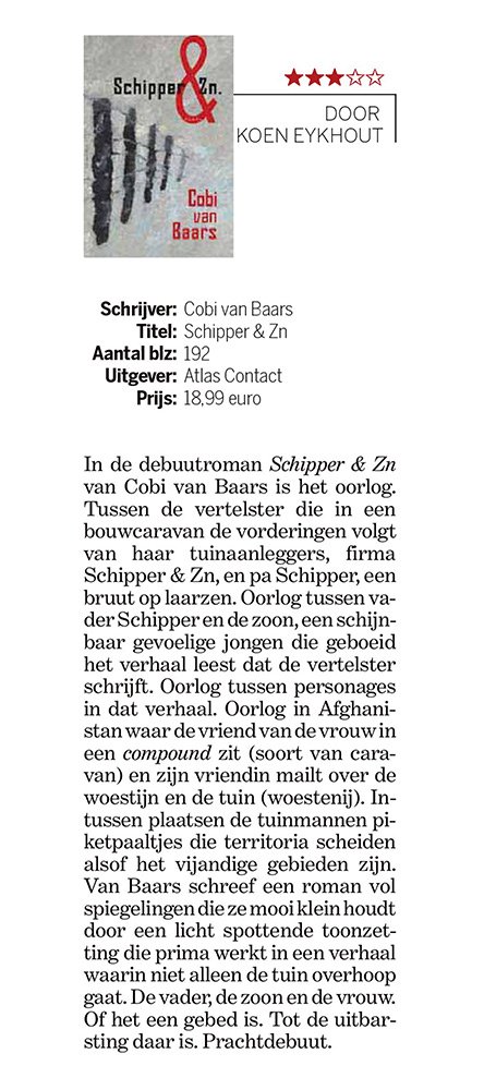 ‘In de debuutroman Schipper & Zn. van Cobi van Baars is het oorlog. Tussen de vertelster die in een bouwcaravan de vorderingen volgt van haar tuinaanleggers, firma Schipper & Zn, en pa Schipper, een bruut op laarzen. Prachtdebuut.’